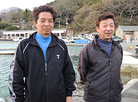 古内社長(右)と佐藤信也専務。背後は狐崎漁港と再建中の共同処理場