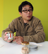 赤坂社長。手前のビンは開発中の新商品