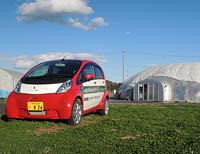 白いドームは野菜工場。電気自動車は体験学習にも活用している