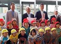 送迎バスを寄贈した大高善興社長(後列左から2人目)