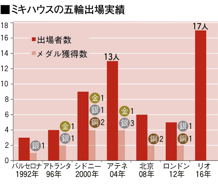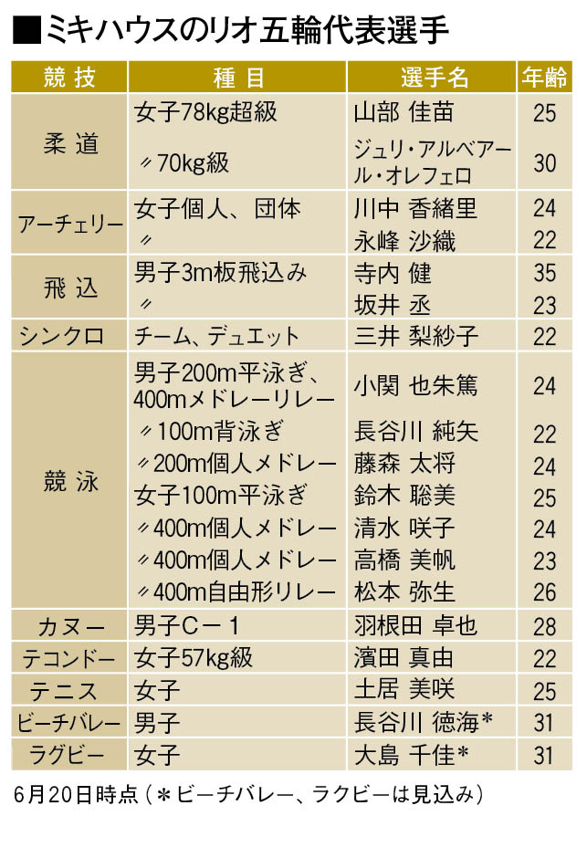 リオ五輪に出場する日本選手は約300人。このうちミキハウスは17人を送り込む(上表)。「最大で19選手に増える可能性があり、リオ五輪における法人の最多選手団としてギネス申請を準備中です」と、ミキハウスの木村皓一社長は微笑む。安倍首相をはじめ各界の著名人がリオ五輪でのチームミキハウスの活躍に期待を寄せ、壮行会に駆けつけるゆえんである。