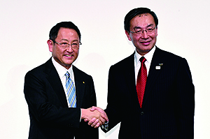 記者会見でパナソニック津賀一宏社長(右)と握手するトヨタ自動車豊田章男社長