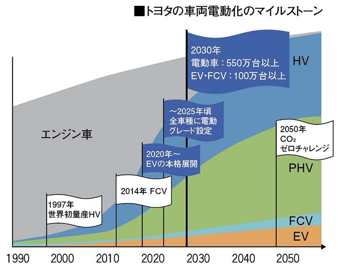 トヨタは昨年末、2030年までの電動車(ハイブリッド車=HV、プラグインハイブリッド車=PHV、電気自動車=EV、燃料電池車=FCV)普及に向けたチャレンジを公表した。「現在、年間約150万台の電動車販売を30年までに550万台に拡大します。その実現のために異次元の取り組みを開始します」(寺師茂樹副社長)