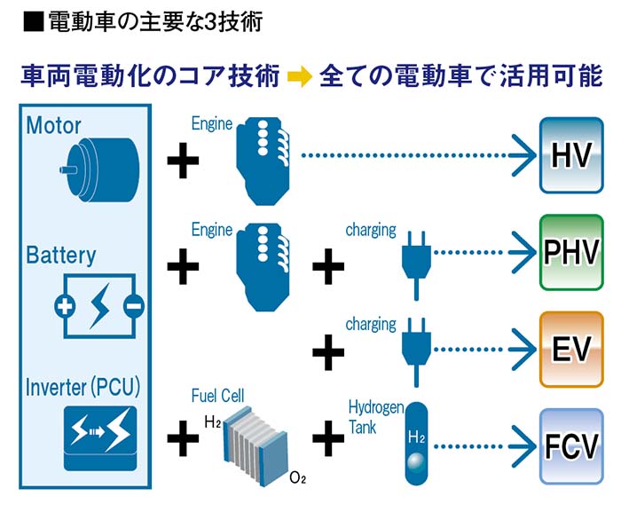 97年に世界初の量産HV「プリウス」を発売し、これまで90以上の国・地域で1100万台以上の電動車を販売してきたトヨタは、クルマのCO2削減をリードする「電動車のパイオニア」だ。14年には究極のエコカーとして、FCV「MIRAI」を世界に先駆け発売し、20年には中国を出発点にグローバルで10車種以上のEVを販売する計画だ。そこでは、プリウス量産で培った技術とノウハウが注ぎ込まれる。「電動車にとってモーター、バッテリー、インバーターが『三種の神器』です。これにエンジンを組み合わせるとHVができ、充電機能を加えるとPHV、燃料電池と水素タンクを積み込むとFCV、そのままならEVになります」と、トヨタ広報部グローバルコミュニケーション室の技術担当部長・中井久志さんは自信満々だ。