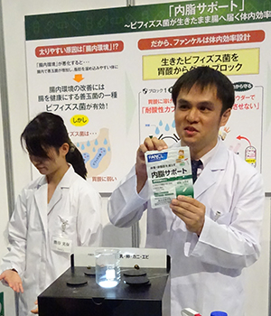 健康食品のブースでは「カロリミット」「えんきん」など話題の商品がずらり。なかでも一押しの機能性表示食品「内脂サポート」の説明には大きな人だかりができていた。ファンケル総合研究所で開発を担当した研究者が、実験室さながら白衣姿で登場。生きたビフィズス菌を胃酸から守り、腸まで届かせるファンケル独自の製法を実演し、鋭い質問の数々に答えていた。