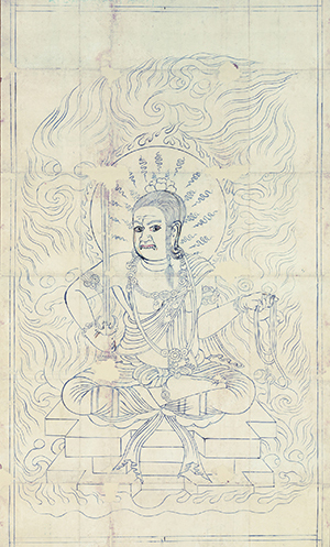 本展がユニークなのは、こうした「ご本尊」が造られた背景にも踏み込んだところだ。例えば「不動のメッカ」といわれる醍醐寺伝来の「白描図(はくょうず)」特集。「白描図とは仏像や仏画の下図となるもので、醍醐寺に多くの品々が伝わります。こちらの重文『不動明王図像』(④)は、絵画としても非常に美しく、長賀の画技を示す名品です。重文『不動明王坐像』(③)とほぼ同じ姿で描かれており、快慶がこのような図像を参考にしたことも考えられます」(佐々木さん)