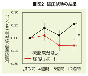 臨床試験では、血清尿酸値が高め(6・0~7・0㎎/dL)の20歳以上60歳未満の男性80人を「尿酸サポート群」と「プラセボ(外見は同じだが成分が入っていない偽物)群」に分けて、それぞれ12週間摂取した後に尿酸値を比較した。有効な被験者78人の解析で尿酸サポート群はプラセボ群に比べて尿酸値の変化量がより低くなっていることが確認された(図2参照)。