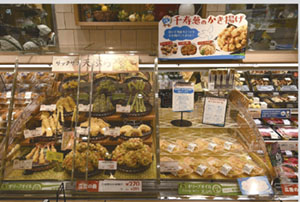 店に入ると、生鮮食品もさることながら、総菜や弁当の売り場が充実している。揚げ物やサラダ類、寿司などそれぞれに種類が豊富。焼いたり温めたりの一手間をかけるだけで完成する調味料つきの簡便商品や、カット野菜も多く並ぶ。素材だけでなく、共働き世帯や一人世帯など、食に関するさまざまなニーズに応えた売り場構成という印象だ。