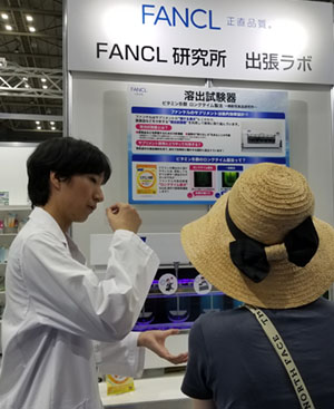 ブース内側の展示コーナーでは、サプリメントがゆっくり溶けて長くとどまる「ロングタイム製法」、青汁の色とおいしさを保つための「生濃縮製法」といったファンケルの独自技術を、研究員が機械を動かし実演しながら紹介。どんな質問にも丁寧に向き合っている姿から商品への愛情や誇りが伝わってきた。
