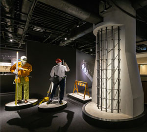 続く「まるごとマンションづくり」のゾーンには、実際に利用する鉄筋や部材が展示され、手で触れ、持ち上げることもできる。設計コーナーには、図面を手書きしていた時代からパソコンによる作図まで、設計者のデスクまわりが再現され、エンジニアにはたまらない空間だろう。