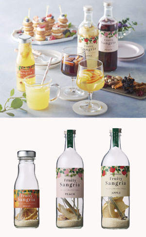 自家製サングリアのもと「HOME MADE FRUITY SANGRIA」(GNS・福島県二本松市)は、「りんご」と「もも」の2本セット。ほかに、単品で「みかん」もある。