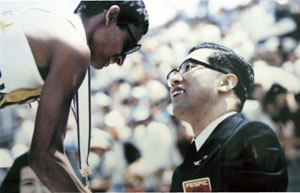 1975年第1回フェスピック(極東・南太平洋身体障害者スポーツ大会)の表彰式(大分)で中村裕博士