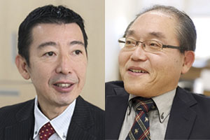 三菱商事太陽の福井秀樹社長(左)、太陽の家の山下達夫理事長(右)