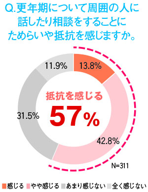 調査では、家族や友人などとのコミュニケーションの難しさも浮き彫りとなった。支障を感じる人の約9割が身近な人に相談したいと回答した一方、6割以上の人が周囲に話すことに抵抗を感じているという結果が出た。理由として「症状の理解を得にくい」「経験した人でないと理解できない」「言われても困るのではないか」「年をとったと思われなくない」といった声が挙がった。それに対し、同居する家族の調査では、妻や母親の更年期について話すことに抵抗を感じている人は約3割と少なく、両者で理解や意識に差があることが判明した。